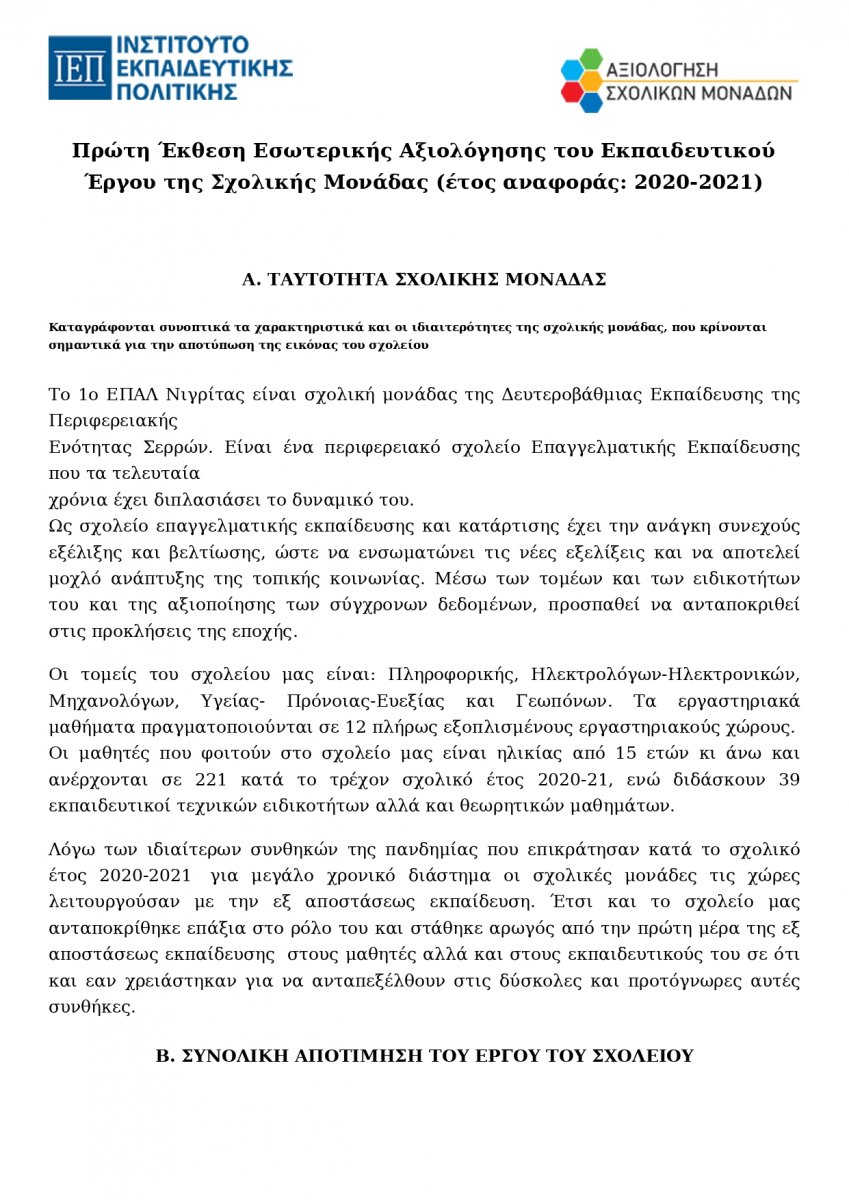 Έκθεση Εσωτερικής Αξιολόγησης 2020-2021