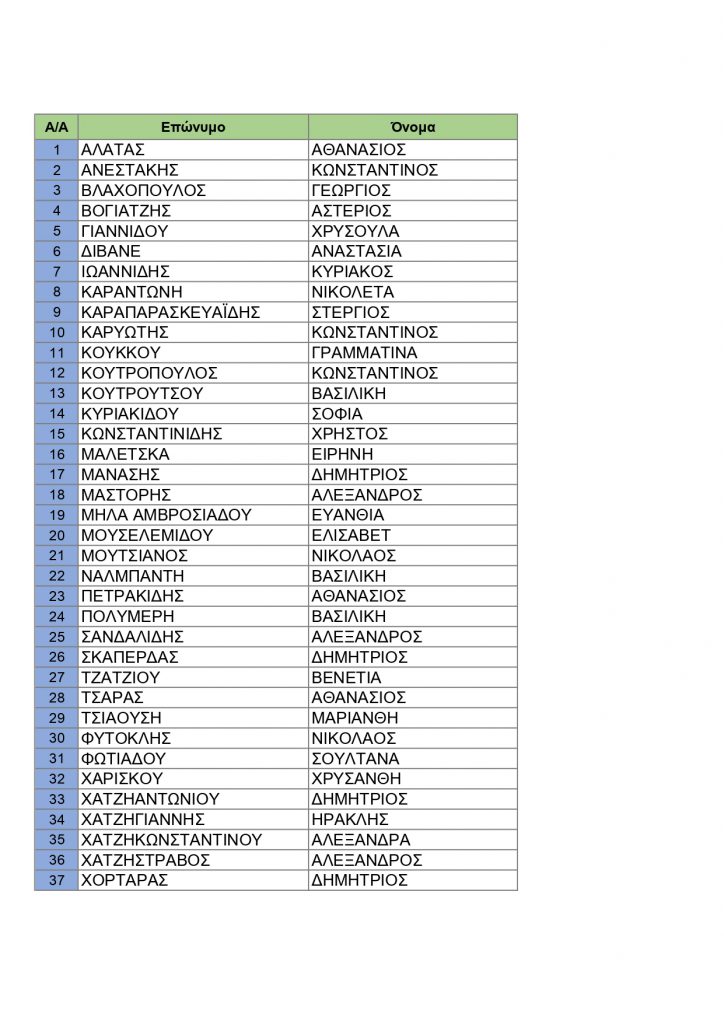 Α/Α Επώνυμο Όνομα Ειδικότητα 1 ΑΠΤΑΛΙΔΗΣ ΤΗΛΕΜΑΧΟΣ ΜΑΘΗΜΑΤΙΚΟΙ 2 ΒΑΚΟΥΦΤΣΗ ΑΙΚΑΤΕΡΙΝΗ ΓΕΩΛΟΓΟΙ 3 ΒΟΓΙΑΤΖΗΣ ΑΣΤΕΡΙΟΣ ΧΗΜΙΚΟΙ 4 ΓΑΤΣΙΟΥ ΔΗΜΗΤΡΑ ΦΙΛΟΛΟΓΟΙ 5 ΓΙΑΝΝΙΔΟΥ ΧΡΥΣΟΥΛΑ ΦΥΣΙΚΟΙ 6 ΔΙΒΑΝΕ ΑΝΑΣΤΑΣΙΑ ΒΡΕΦΟΝΗΠΙΟΚΟΜΩΝ 7 ΙΩΑΝΝΙΔΗΣ ΚΥΡΙΑΚΟΣ ΠΟΛ.ΜΗΧΑΝΙΚΩΝ-ΑΡΧΙΤΕΚΤΟΝΩΝ 8 ΚΑΡΑΝΤΩΝΗ ΝΙΚΟΛΕΤΑ ΒΡΕΦΟΝΗΠΙΟΚΟΜΩΝ 9 ΚΑΡΑΠΑΡΑΣΚΕΥΑΪΔΗΣ ΣΤΕΡΓΙΟΣ ΗΛΕΚΤΡΟΛΟΓΩΝ Read More …
